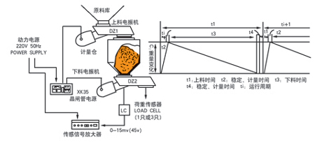 工作原理:在一个完整的T运行周期内,计算机根据设定下料值,先控制DZ1工作,在t1时间内完成上料,然后经t2时间稳定,计重量。在t3下料时间内DZ2工作,连续稳定的送出物料,并保证在t3时间结束时,刚好送出设定的物料量,然后经t4时间稳定,计重量,再计算上料结束和下料结束两次计量值之差,即得到此次下煜的精确值(静态计量值),然后将次下料值与设定值比较,自动将其误差传到下一个周期进行补偿。是国家建材局优选节能配料设备之一。