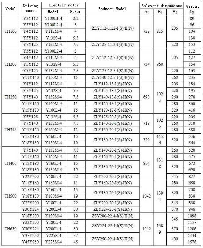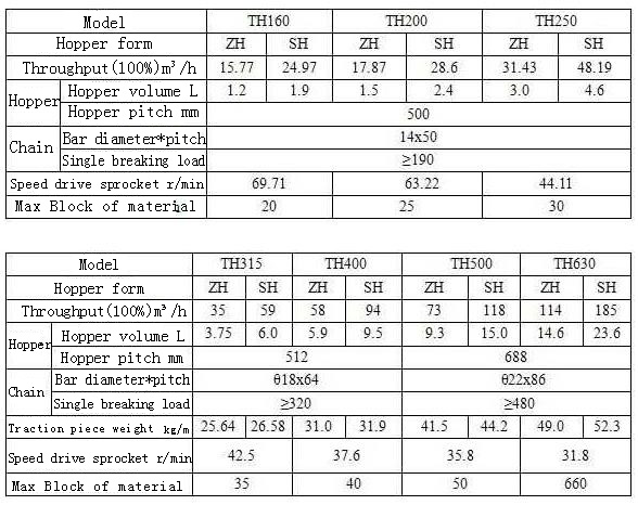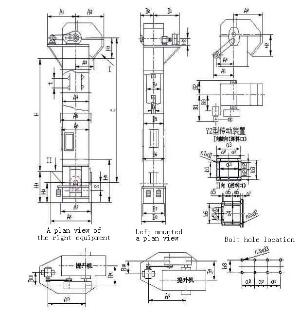 First, TH-type bucket elevator use: TH-type bucket elevator with throughput, improve high, stable and reliable operation and long life significant advantages. The main technical performance and parameters of vertical bucket elevator line with international standards and foreign advanced standards; traction adopts ring chain, in line with mining high strength ring chain. Second, TH-type bucket elevator Features: 1, the transport capacity, the same bucket wide model TH-bucket elevator and HL-bucket elevator model compared to throughput increases nearly doubled; 2, assembled sprocket with the wheel rim connection is made with high strength bolts. In the sprocket wear to a certain extent, you can unscrew bolts, removable rim, easy to replace, and save demolition materials, reducing maintenance costs; 3, the lower part of the body with a hammer leveraged tensioning device, you can achieve automatic tensioning. After the first installation without adjustment, and can maintain a constant tension, thus ensuring the normal operation of the machine, to avoid slipping or off the chain; 4, pulling pieces of high strength low alloy ring chain, after appropriate heat treatment, with high tensile strength and abrasion resistance, long service life. The elevator is a mixed mode or gravity discharge, dig loader for conveying bulk density of not more than 1.5 tons of powdered / m3 of granular, small block of low-mill cut materials, temperature of the material must not exceed 250 degrees . Available in two hopper: ZH-type (deep bucket) is generally used to transport wet, agglomeration, thrown more difficult materials, such as wet sand, sand, fertilizer, alkali powder. SH type (deep bucket) is generally used to transport dry, easy thrown loose materials, such as cement, gravel, coal and so on. TH-type bucket elevator drive device has two kinds of forms, each with ZJ reducer and ZQ reducer. ZJ type shaft-mounted reducer suit directly in the spindle axis head, eliminating the hoist drive platform, coupling, so that TH-type bucket elevator is compact, lightweight, and with internal shaped roller backstop, backstop reliable, low noise of the reducer, smooth operation, and with the spindle floating installation can eliminate stress. This machine is Maximum transport capacity 365m3 / h, maximum lifting height of 50m. Third, TH-type bucket elevator structure diagram: