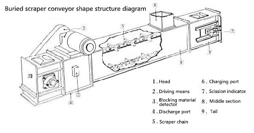Buried scraper conveyor Product Overview: Buried scraper conveyor series products are widely used in metallurgy, building materials, electricity, chemicals, cement, ports, terminals, coal, mining, oil, food, feed, and other industries and sectors. Buried scraper conveyor is a giant in a closed-shaped section of the housing by means of a moving scraper chain to deliver continuous bulk material transport equipment; as in the transportation of materials, scraper chain among all buried in the material , so it called en masse conveyor. Simple structure, good sealing, easy installation and maintenance, process layout flexible; it is not only the level of transmission, but also inclined or vertical transport; either stand-alone use, but also more than one joint use; can do more to feed, but also more point of discharge.Because of the closed shell, and therefore transport large, toxic, explosive, can significantly improve workers' working conditions and environmental pollution prevention and control high-temperature materials. Buried scraper conveyor is a much metallurgy, mining, thermal power plants welcome conveying material system equipment. Buried scraper conveyor Product Abstract: Buried scraper conveyor is a rectangular cross-section in a closed shell by means of a moving scraper chain conveyor continuous bulk material transport equipment strong, because in the transportation process, scraper chain It is buried in the material being conveyed, and therefore called "buried scraper conveyor." Buried scraper conveyor in a horizontal conveyor, the material by scraper chain pressure and the material in the direction of movement of the weight of its own role in the internal friction between the material produced. This ensures the steady state friction material layer, and sufficient to overcome the external friction material in the machine tank movement generated, so that the material to form a continuous whole stream is conveyed. When vertical lifting, the material by scraper chain in the direction of movement of the pressure, resulting in a transverse direction of the side of the pressure in the material, the formation of the internal friction of the material.At the same time due to the constant feeding the lower horizontal section. The lower part of the upper material of the material have been produced tractive force. This force is sufficient to overcome the friction and goes outside the friction material in the machine slot and material movement generated by its own weight, the material forms a continuous stream and is integral promotion. Scraper conveyor simple mechanism, light weight, small size, strong sealing, installation and maintenance more convenient; it is not only the level of transmission, but also to tilt or vertical lift transport; can do more to feed, but also multi-point discharge conveyor more flexible process layout.Since the case is closed, which convey Gigalight, toxic, explosive, high temperature materials, to improve the operating conditions of the workers and to prevent environmental pollution and other aspects of the more prominent advantages. Scraper conveyor product structure diagram Buried: