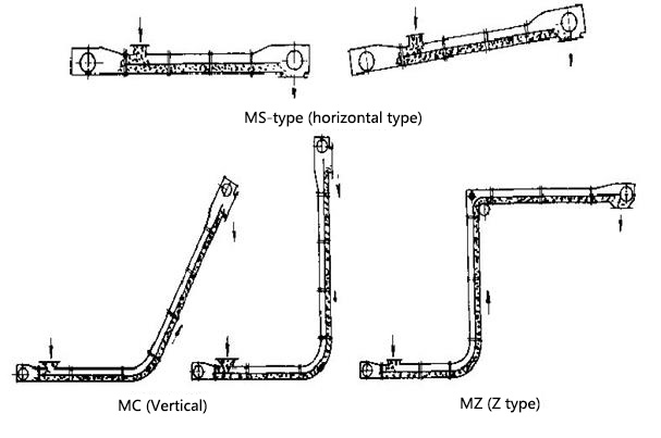 Laying flat surface conveyor needs, as there are within conveyor plane excessive bending, it will inevitably lead to discontinuity two chains, accelerated wear between chain and groove wall cast stone, and even card chain. Each segment should be flat without overlapping tank level. Due to structural constraints tank itself, adjacent the central groove deflected in the vertical direction should not be too large. If the conveyor is not laying flat, transportation consumption will increase. Machine aisle product coal or debris should be swept away. 3) Install the nose and tail: Nose and tail should leave some space, easy maintenance and repair. Sprocket centerline perpendicular to the centerline of the conveyor, and the level of assurance. 4) mounted scraper chain: Scraper chain prior to installation, should be pre-connected, the blade is evenly distributed in the chain. If the two chains, to choose equal length, or press the pairing chain assembly factory. The chain may not have reverse phenomenon. Ring chain seam side up to prevent the chain and sprocket grip phenomenon occurs. 5) Check and empty running: After the conveyor is installed, it should conduct a comprehensive inspection and start the conveyor. Air operation 2h, mainly the drive means and the blade is functioning properly. At the same time, so that abut the adjacent middle slots, again tight chain, adjust the chain length. Scraper conveyor within the first two weeks of work, should pay special attention to the tightness of the chain. The method of inspection is: If the tail drive means, then jog the drive unit, when the shares of the tail sprocket chain more than two full relaxation of chain link, the need to dismantle the chain tight chain or minus ring, reducing link lengths. If only the head drive means you will need to reverse jog the motor, when the shares of the chain at the nose sprocket with more than two full relaxation of chain ring. Also we need to dismantle the chain tight chain or subtract rings. Buried scraper conveyor is mainly divided into the following types: 1, the horizontal-type buried scraper conveyor 2, a vertical-type buried scraper conveyor 3, Z-type buried scraper conveyor